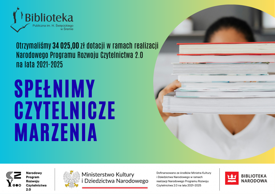 Złożony przez Bibliotekę Publiczną w Śremie wniosek został pozytywnie rozpatrzony i zdobyliśmy dotację na zakup nowości wydawniczych. Środki pochodzą od Ministra Kultury i Dziedzictwa Narodowego w związku z realizacją Narodowego Programu Rozwoju Czytelnictwa 2.0 na lata 2021–2025 Priorytet 1 Kierunek interwencja 1.1. Zakup i zdalny dostęp do nowości wydawniczych.